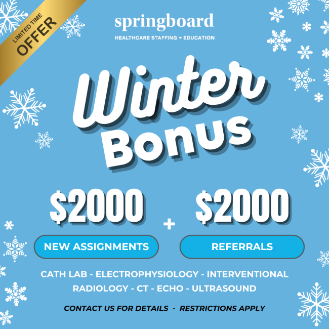 Winter is coming and we want to give you up to $2000 to try the Team Springboard experience! We’re looking for nurses and techs in Cath Lab, Electrophysiology, and Interventional Radiology, CT, Echo, and Ultrasound just like you for high-paying positions across the country. Get your bonus by meeting the following criteria: